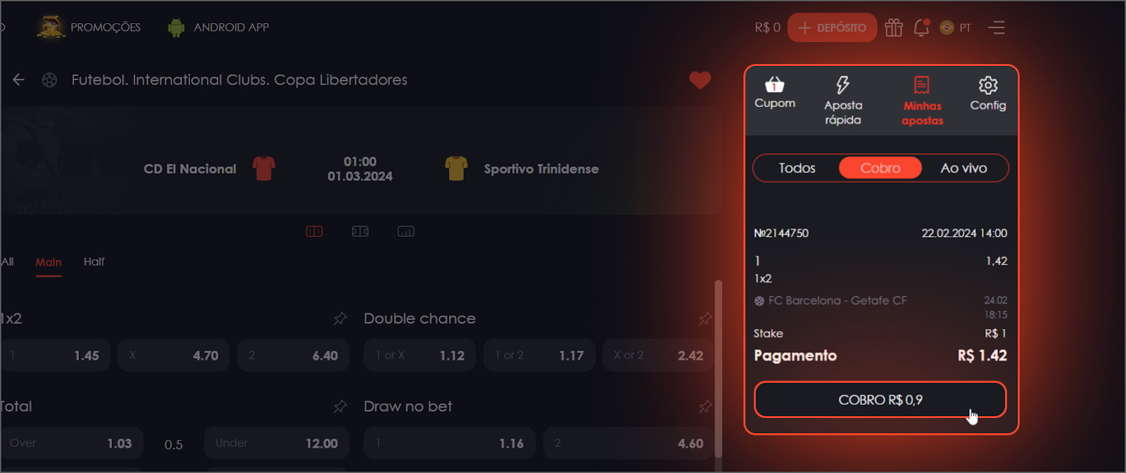 The amount of money you receive will be determined at the time of the immediate cashout and will depend on the odds of your bet winning at that moment; therefore, it could be higher or lower than the initial bet value. You do not have to wait until the match is over to have the money in your account, the immediate cashout is instantaneous and your balance will be updated as soon as you confirm the immediate cashout.