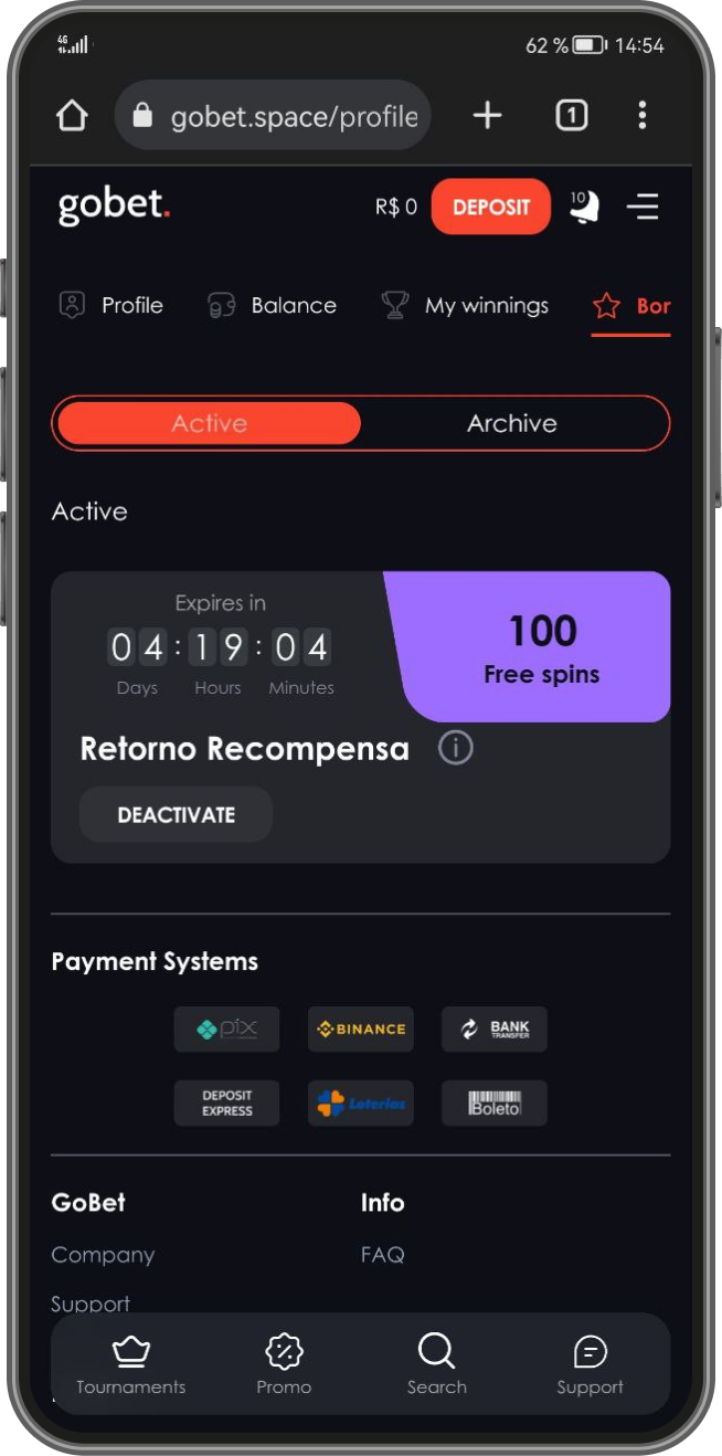 Você pode ver seus bônus atuais em sua conta pessoal após fazer login em sua conta, na seção BÔNUS.